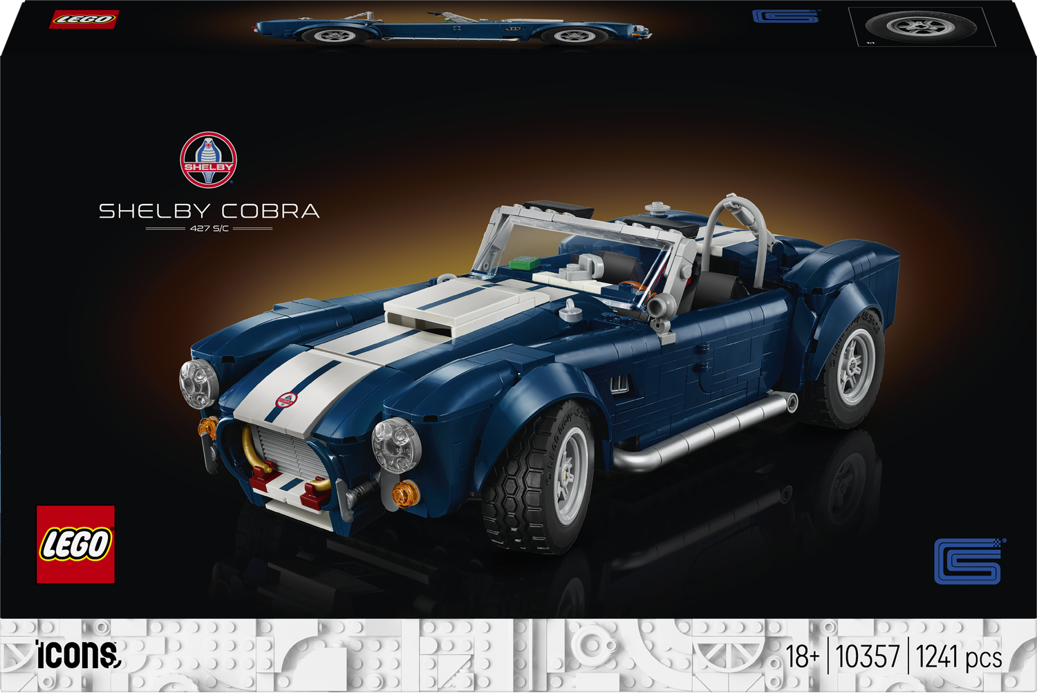 Ten model zabytkowego samochodu z klocków LEGO ma eleganckie niebieskie nadwozie z charakterystycznymi dla Shelby’ego białymi paskami, boczne wydechy i kratkę wlotu powietrza. Funkcje modelu obejmują działający układ kierowniczy i otwierane drzwi, bagażnik i maskę. Dodatkowo samochód LEGO ma szczegółową komorę silnika, skrzynkę narzędziową, która mieści się w bagażniku, gaśnicę, którą można zamontować między siedzeniami, banknot studolarowy i puchar upamiętniający znakomitą wyścigową historię tego auta. Zestaw konstrukcyjny LEGO Icons Shelby Cobra 427 S/C to świetny pomysł na prezent dla mężczyzny — na urodziny, imieniny czy święta. Ten model samochodu dla dorosłych będzie służył jako urocza ozdoba do domu i do biura.