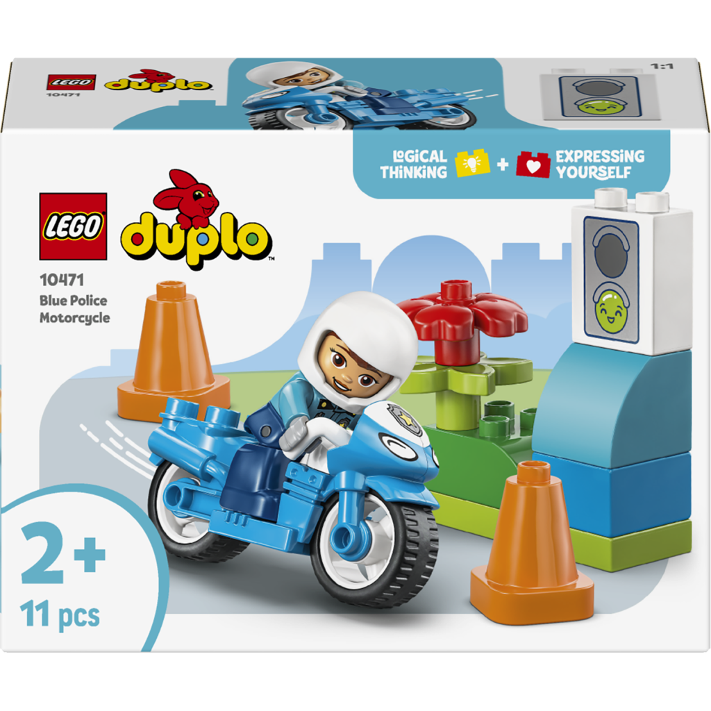 Klocki dla 2-latka LEGO DUPLO Niebieski motocykl policyjny (10471) to urocza zabawka dla dziecka, która zapewni ciekawą zabawę dzieciom w wieku od 2 lat. Ten zestaw klocków edukacyjnych pozwala maluchom odgrywać historie z policjantką, która wyrusza na patrol na motocyklu LEGO DUPLO