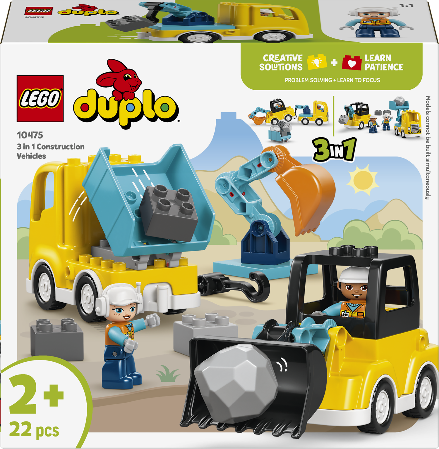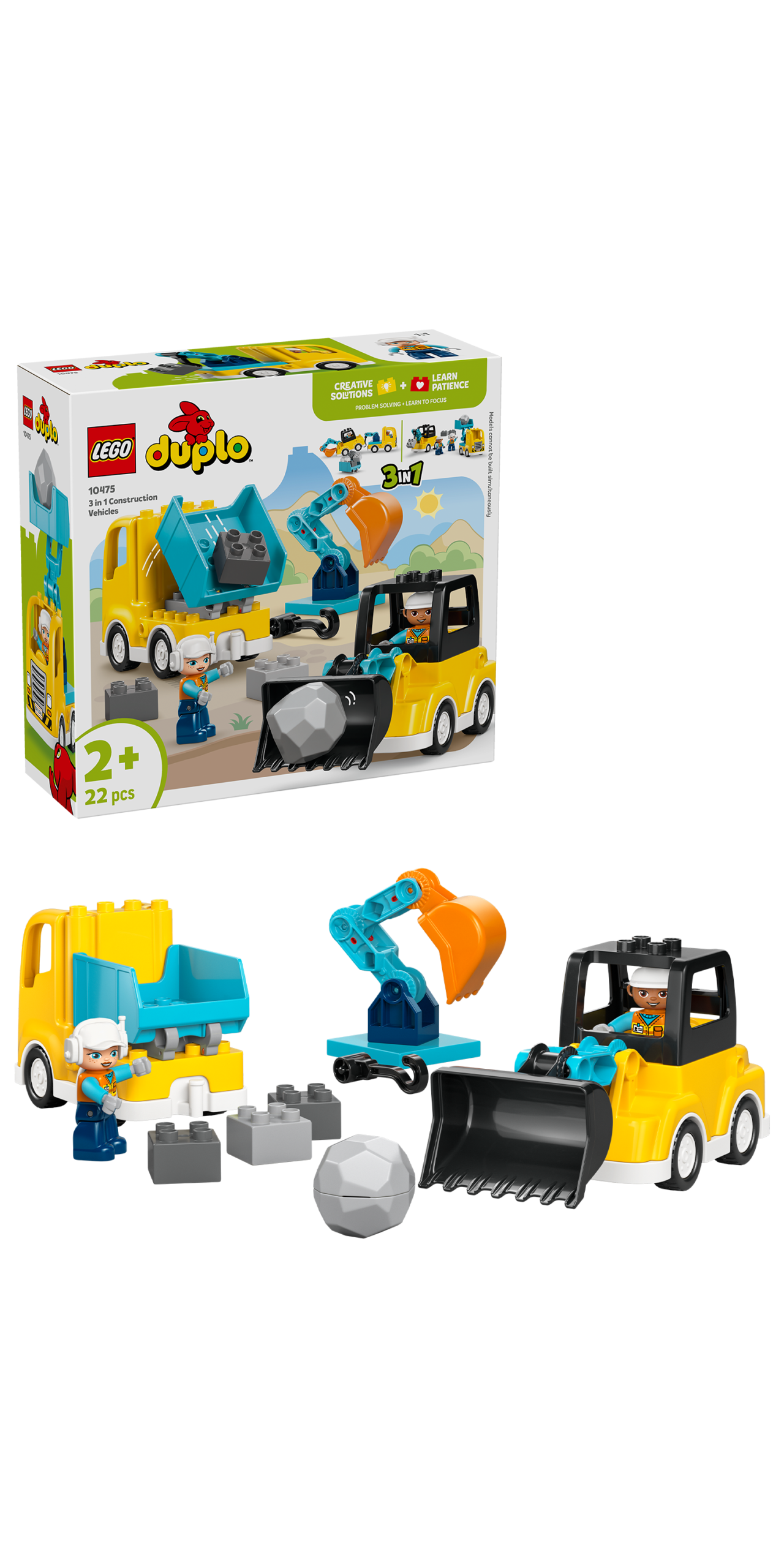 Rozbudź kreatywność malucha dzięki zestawowi klocków dla 2-latka LEGO DUPLO Maszyny budowlane 3 w 1 (10475). Ta zabawka dla małego dziecka w wieku od 2 lat pozwoli dzieciom tworzyć własne, kreatywne pojazdy. Zabawę urozmaica przebudowywanie, ponieważ maluchy wykorzystują swoją koncentrację, aby stworzyć sześć różnych zabawkowych ciężarówek.