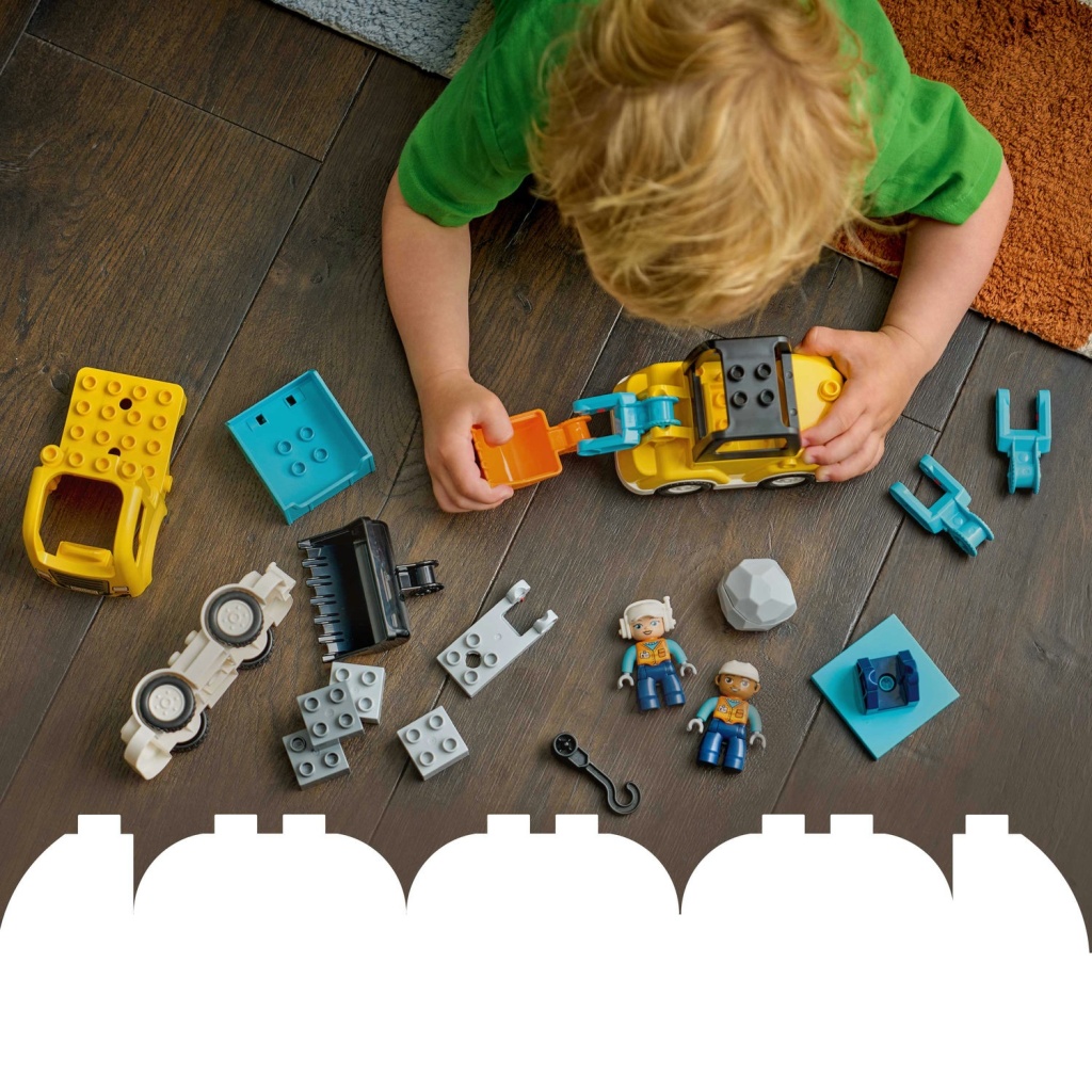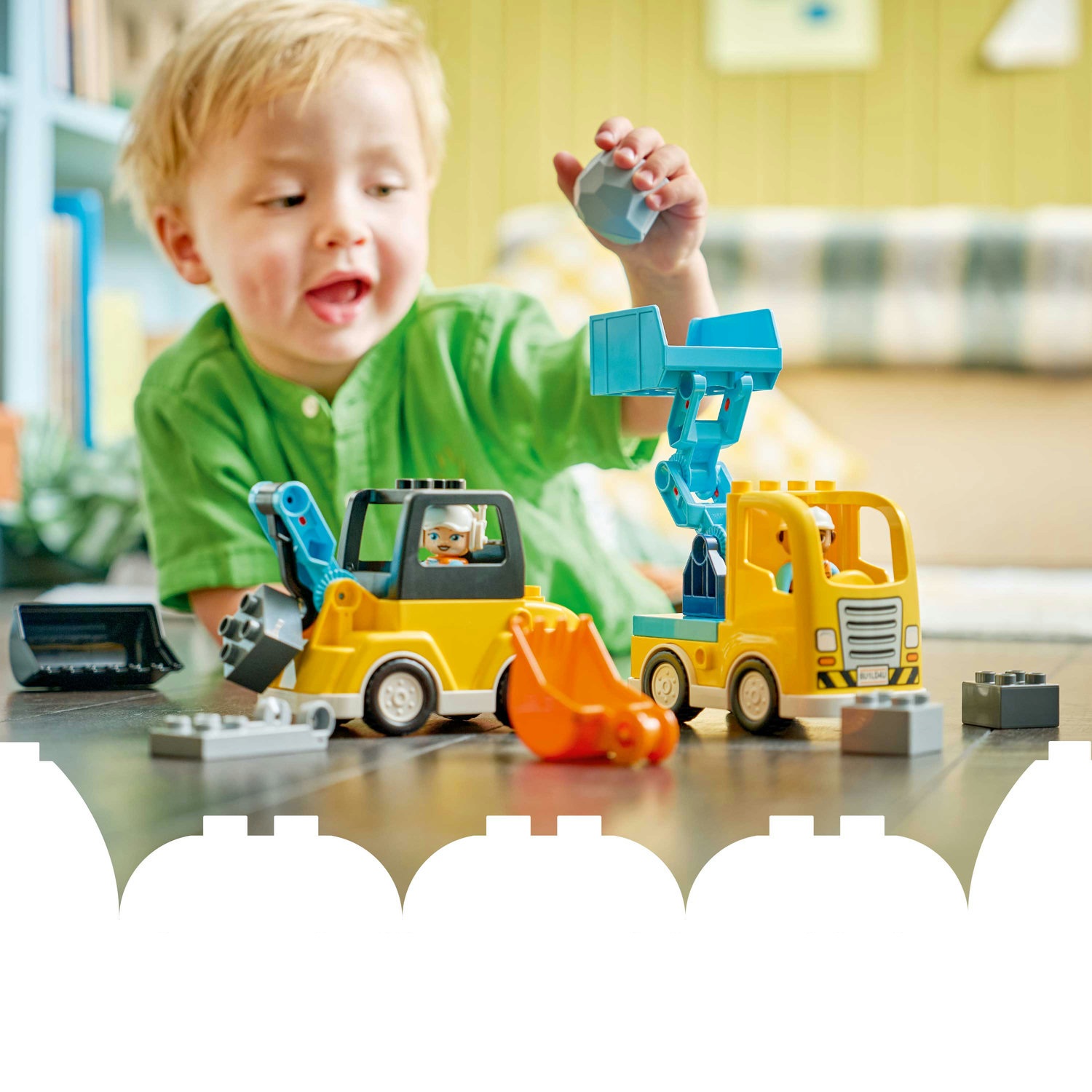 Ten zestaw klocków LEGO DUPLO dla chłopczyka i dziewczynki składa się z 22 klocków, z których można zbudować trzy pary ciężarówek: ładowarkę z lemieszem, która napełnia ciężarówkę klockami DUPLO, koparkę i lawetę z obrotowym ramieniem lub podnośnik nożycowy i drugą lawetę z mniejszym hakiem do podnoszenia klocków. Zachęć małych konstruktorów do wykorzystywania kreatywności, umiejętności rozwiązywania problemów, wytrwałości i zdolności motorycznych, aby eksperymentować z różnymi rozwiązaniami i tworzyć pomysłowe ciężarówki. W zestawie klocków do budowania znajdują się również dwie figurki pracowników budowlanych, które maluchy mogą usadzić za kierownicą, aby obsługiwały pojazdy LEGO.