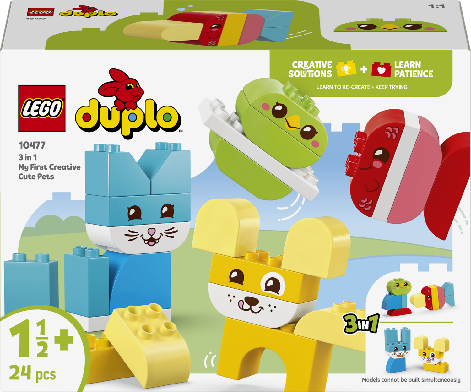 Korzystając z 24 łatwych w obsłudze dużych klocków dla małych dzieci, zaprojektowanych specjalnie dla najmłodszych, mali konstruktorzy mogą wybierać spośród figurek psa, kota, ptaka, królika, myszy i ryby do zbudowania. Niektóre z tych zabawek wykorzystują jednokolorowe klocki LEGO DUPLO. Maluchy mogą nauczyć się sortować elementy według kolorów, aby zbudować swoje figurki zwierząt DUPLO, a następnie skończyć figurki, dodając uroczą twarz zwierzęcia.