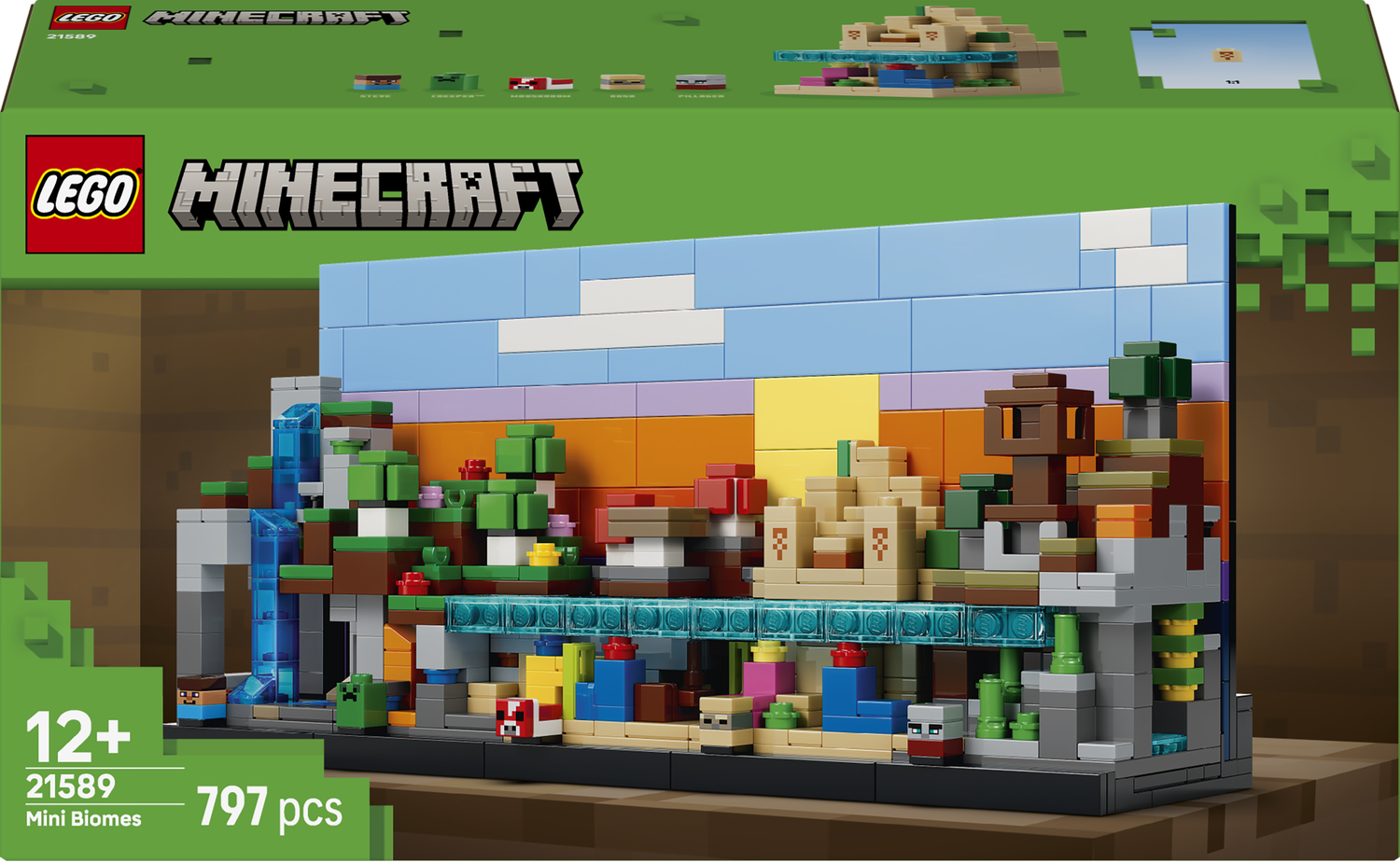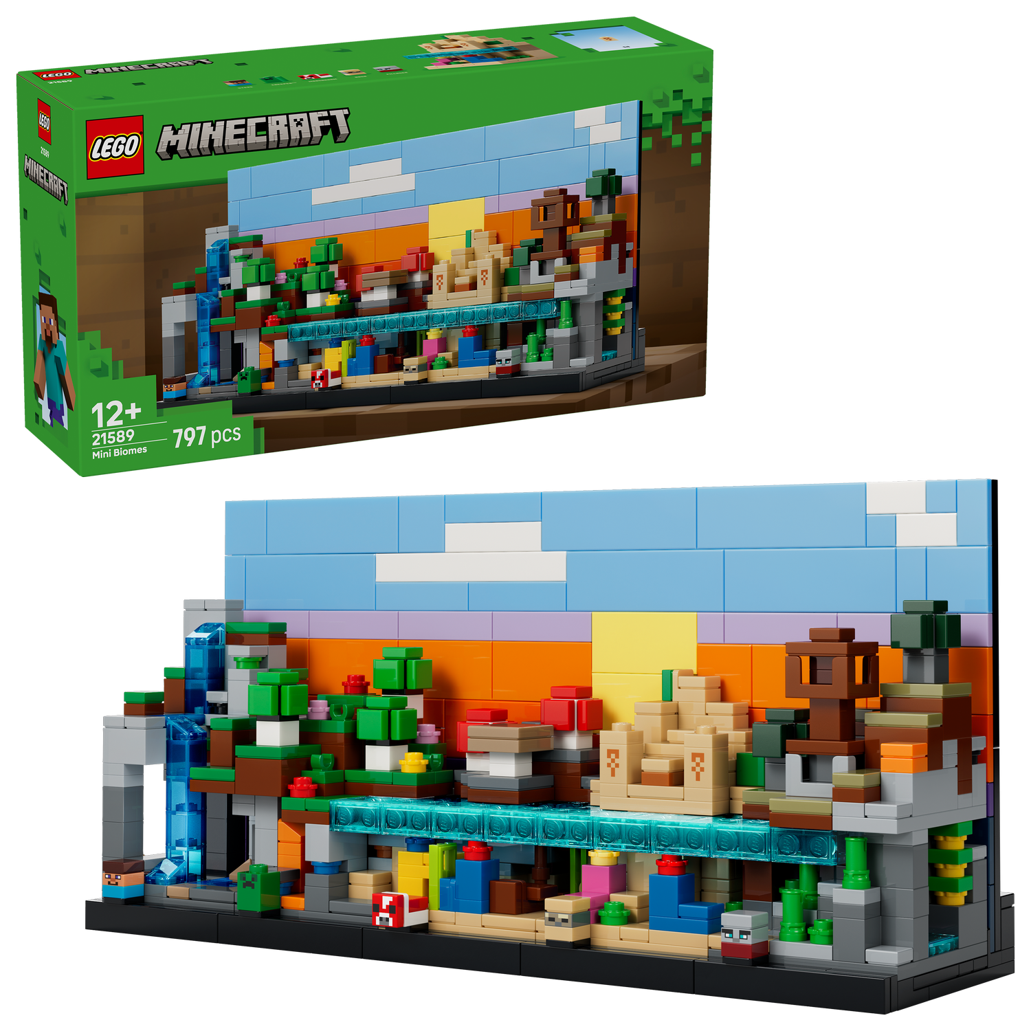 Zabawka LEGO Minecraft dla nastolatków zawiera pięć odczepianych biomów: góry — z jaskinią z naciekami, geodą ametystową i wodospadem; las kwiatowy – z jaskinią, lawą i złotem; grzybowe pola — z rafą koralową, wrakiem statku, dwoma czerwonymi drzewami grzybowymi i brązowym grzybem; pustynię — ze świątynią, rafą koralową, oceanem, kaktusami i skrzynią skarbów; oraz sawanną – z posterunkiem grabieżców, bujną jaskinią, drzewami akacjowymi, dynią, lawą i plażą. W zestawie dzieci znajdą również dwustronne tło przedstawiające dzień i noc.