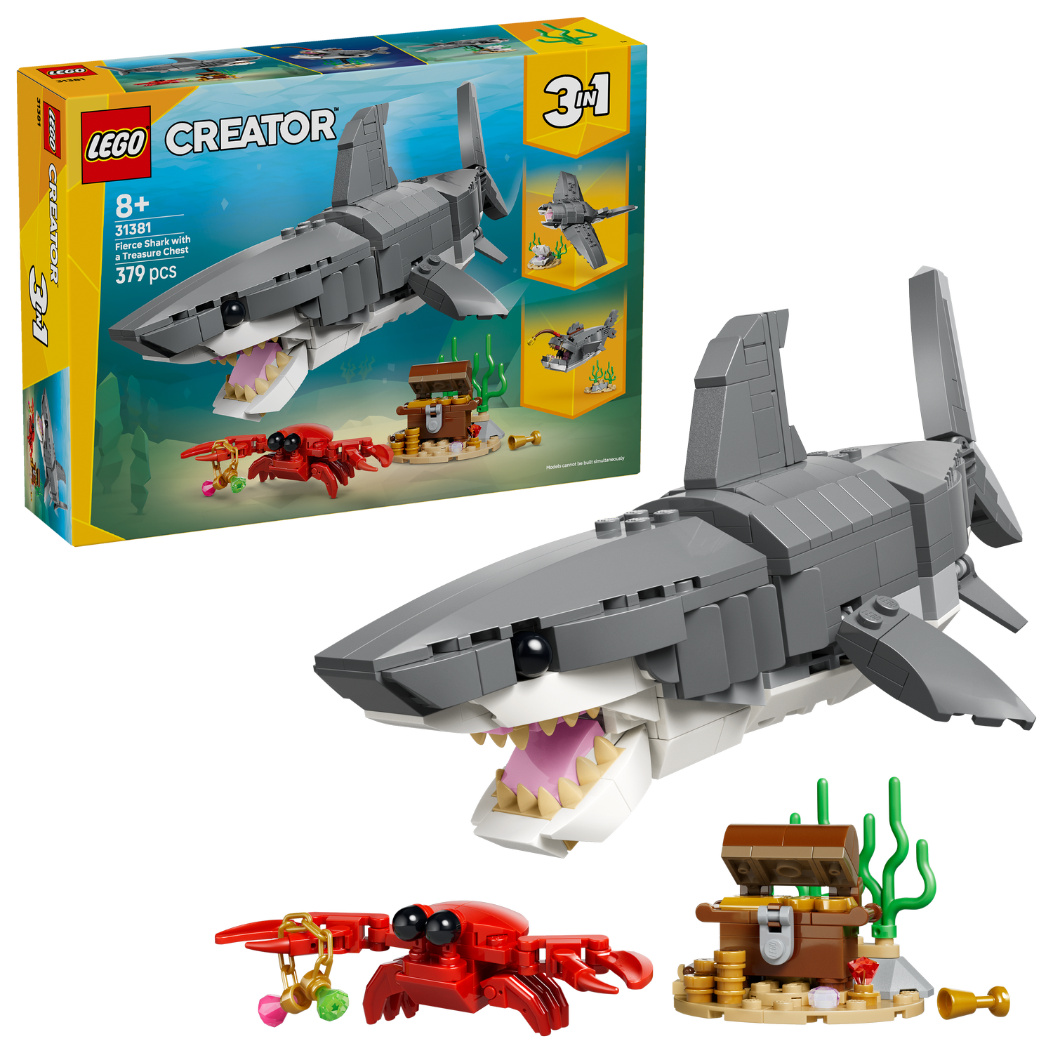 Zestaw klocków dla dzieci LEGO Creator 3 w 1 Groźny rekin i skrzynia ze skarbem (31381) pozwala odgrywać ciekawe, podwodne przygody. Ta zabawka konstrukcyjna dla chłopca i dziewczynki od 8 lat umożliwia dzieciom trzy różne opcje budowania — trzy figurki zwierząt morskich do zbudowania przy użyciu tego samego zestawu klocków.