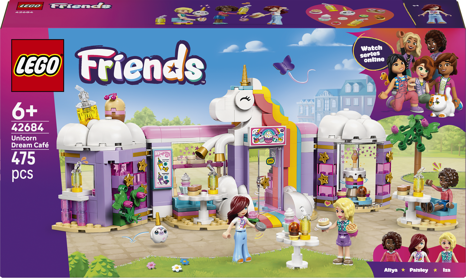 Podaruj dzieciom odrobinę kreatywnej zabawy dzięki zestawowi klocków LEGO Friends Jednorożcowa kawiarnia (42684). Ta kolorowa zabawka dla 6-latki, dla dziewczynki lub chłopca, pozwoli fanom jednorożców odgrywać historie w tęczowej kawiarni, która zawiera wiele uroczych akcesoriów.