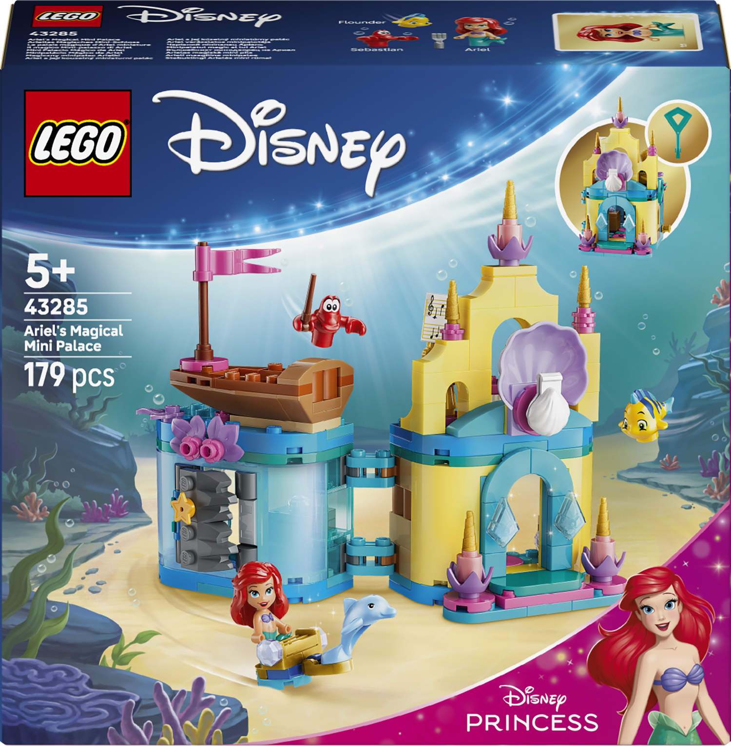 Młodzi fani Arielki mogą odkrywać swoją kreatywność dzięki zestawowi klocków dla dzieci LEGO ǀ Disney Princess Magiczny minipałac Arielki (43285) z filmu Disneya „Mała syrenka”. Zestaw konstrukcyjny w mikroskali to mała zabawka, która zawiera w sobie wielki świat. Ta zabawka dla dziewczynek i chłopców zawiera trzy postacie LEGO ǀ Disney: Arielkę, Florka i Sebastiana, a także mały pałac i grotę, które można zamknąć na klucz, małą łódź i wiele więcej. Przenośna zabawka z zamkiem w mikroskali została stworzona z myślą o zabawie w podróży.