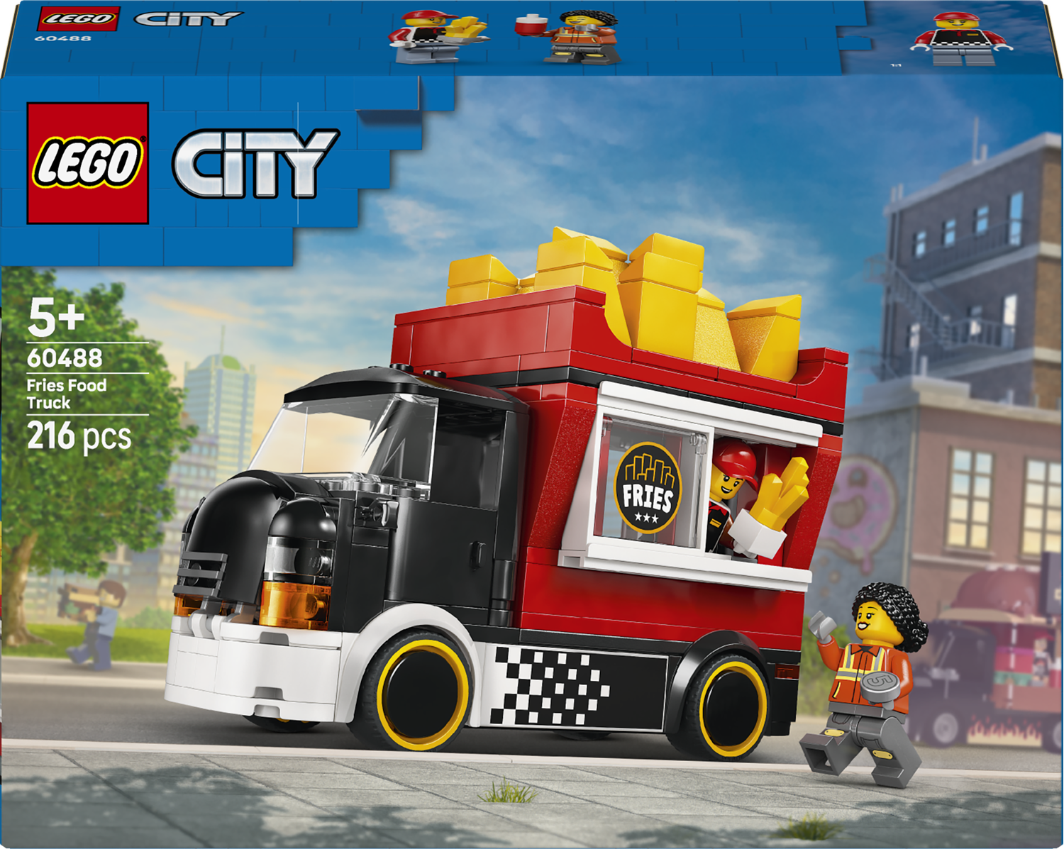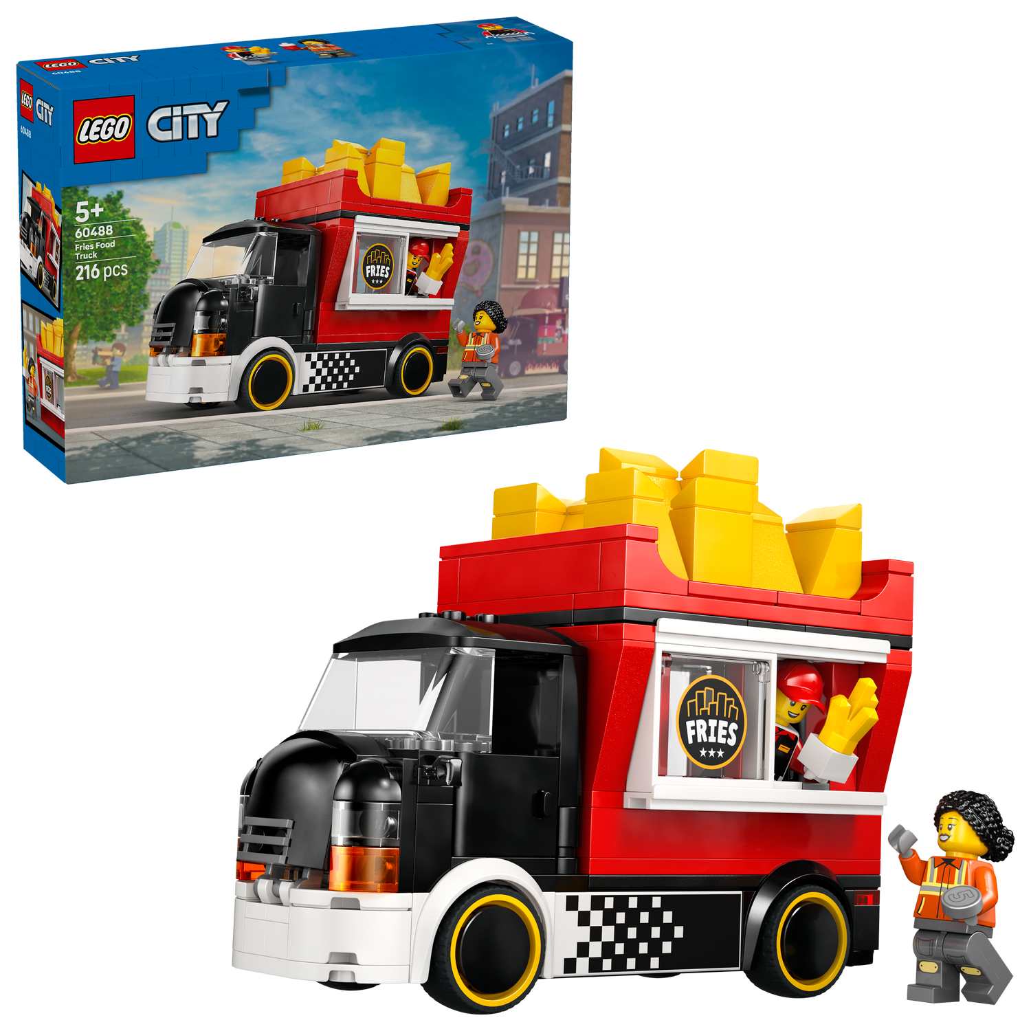 Serwowanie pyszności jest dziecinnie proste dzięki zestawowi klocków LEGO City Food truck z frytkami (60488). Ta zabawka dla 5-latka, dla chłopca i dziewczynki pozwala zbudować kolorowy food truck LEGO. Pojazd wyposażony jest w odczepiany kiosk w kształcie wielkiej porcji frytek. Dzieci mogą zdjąć dach, aby uzyskać dostęp do szczegółowej strefy przygotowywania posiłków, wyposażonej we frytkownicę, przyprawy i przesuwane okienko do obsługi klientów. Ten model samochodu dla dzieci ma również otwieraną maskę z zabawkowym silnikiem oraz minifigurki sprzedawcy i klienta.
