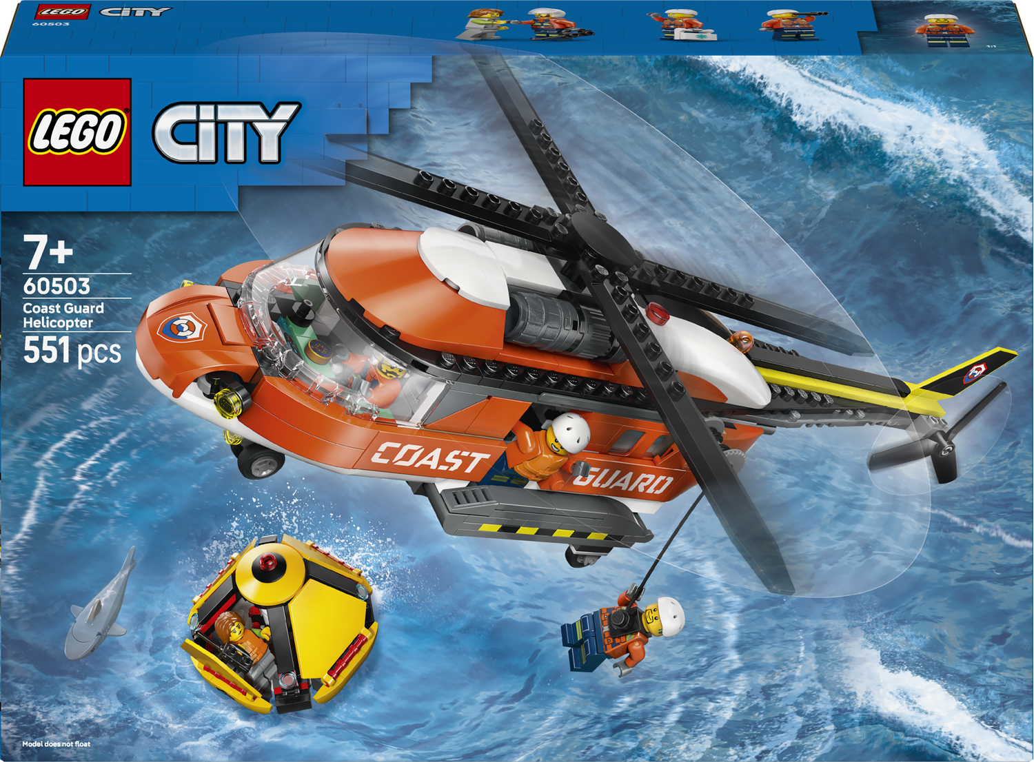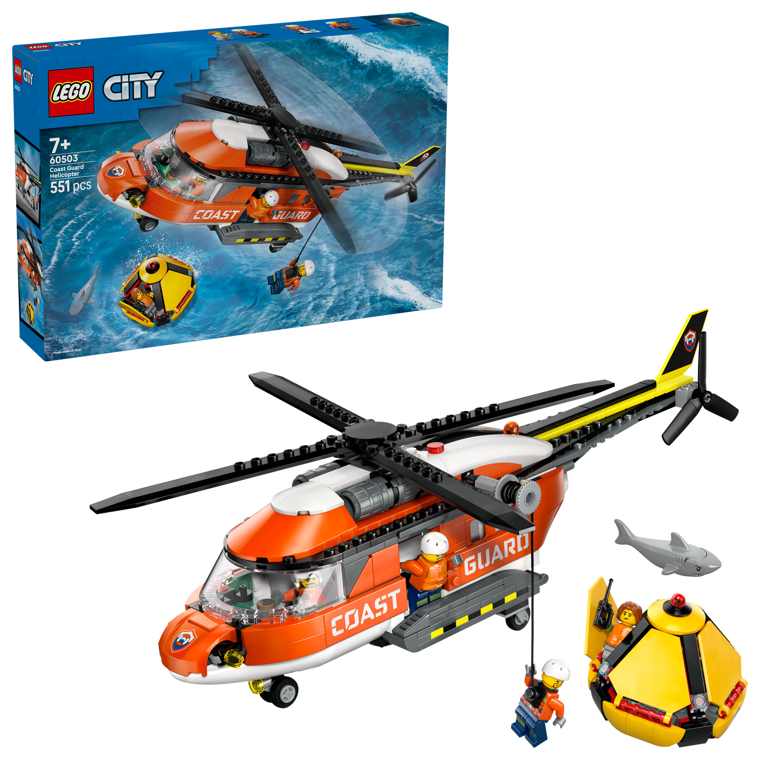 Zestaw klocków LEGO City Helikopter straży przybrzeżnej (60503) jest pełen autentycznych detali dla fanów zabawy w odgrywanie ról i pojazdów ratowniczych. Ta zabawka dla 7-latka przedstawia imponujący model czerwonego helikoptera LEGO, który jest wyposażony w obrotowe śmigła, przesuwane boczne drzwi, składaną tylną rampę oraz szczegółowo odwzorowany kokpit i kadłub. Dzieci mogą opuścić członka załogi za pomocą wyciągarki, a zestaw zawiera również kapsułę ratunkową, którą można rozłożyć, aby uzyskać dostęp do jej wnętrza. Wystarczy dodać pilota, ratowaną osobę, dwóch ratowników i rekina, aby przeżyć wiele godzin kreatywnej zabawy.