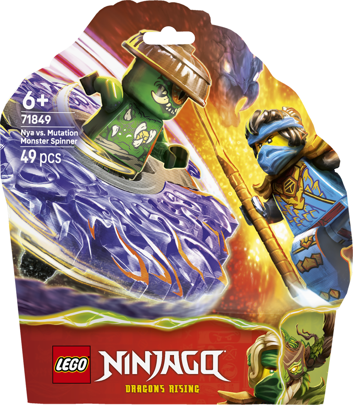 Zestaw klocków dla dzieci LEGO NINJAGO Nya kontra zmutowany potwór na spinnerze (71849) to zabawka dla chłopców i dziewczynek w wieku od 6 lat, która pozwala na odtwarzanie pełnych akcji scen z 4. sezonu serialu „NINJAGO: Powstanie Smoków”. Po zbudowaniu zestawu dzieci mogą nacisnąć przycisk wyrzutni, aby uruchomić wirującą zabawkę i obserwować, czy dwa elementy mocy żywiołów odlecą, gdy zabawka uderzy w cel.