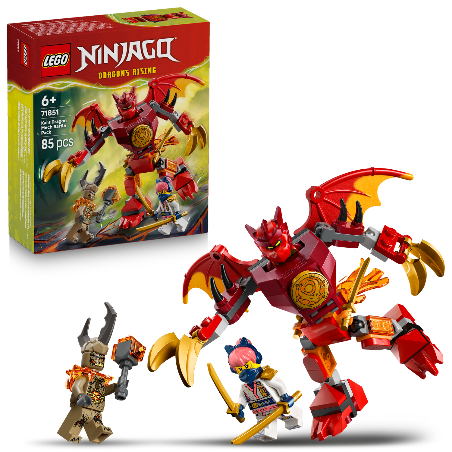 Dzięki zestawowi klocków dla dzieci LEGO Ninjago Smok-mech Kaia — zestaw bitewny (71851) na fanów serialu „NINJAGO: Powstanie Smoków” czeka wiele godzin kreatywnej zabawy. Zabawka konstrukcyjna dla dzieci w wieku od 6 lat zawiera smoka-mecha z ruchomymi nogami, skrzydłami, pazurami i tułowiem obracającym się o 360 stopni, a także kokpitem, w którym można umieścić minifigurkę.