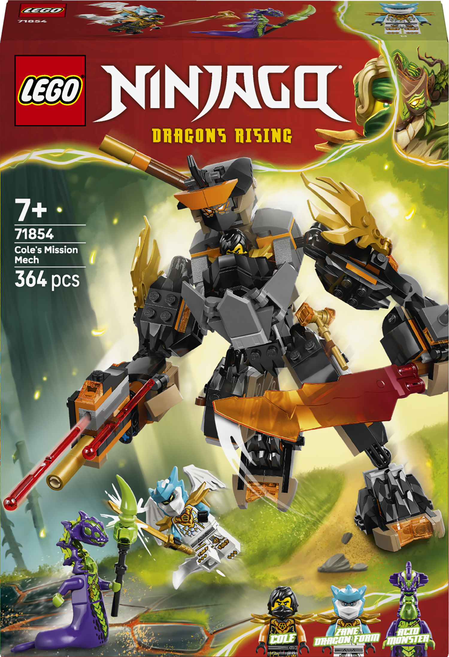 Mech NINJAGO jest wyposażony w trzy bronie: miecz, kostur i sprężynowy miotacz z dwiema strzałkami, które dzieci mogą zamienić na broń z zestawu Bitwa smoka Riyu (71855) (sprzedawanego oddzielnie). Ta zabawka NINJAGO dla chłopca zawiera również trzy minifigurki LEGO NINJAGO: Cole’a z młotem, Zane’a w smoczej formie z mieczem i kwasowego potwora z kosturem do zabawy w odgrywanie ról. Zestaw klocków dla 7-latka świetnie sprawdzi się jako pomysł na prezent urodzinowy dla chłopca i dziewczynki.