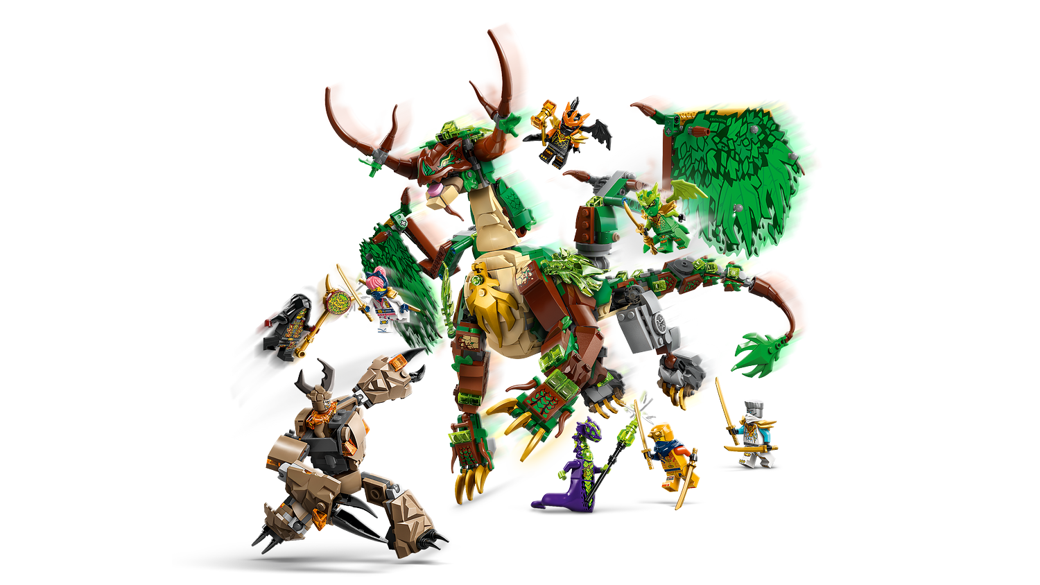 Zabawka konstrukcyjna dla dzieci zawiera dodatkowy model z drzewem i rośliną, który można obrócić, by odkryć złoty miecz i ruchomego minimecha z kokpitem dla minifigurki. Do odgrywania epickich bitew służy osiem minifigurek LEGO NINJAGO: ninja Zane, Sora, Arin, Lloyd i Cole w smoczej formie oraz złowroga trójka: kwasowy potwór, ziemny potwór i przywódca lojalistów. Ten zestaw klocków dla 9-latków świetnie sprawdzi się jako prezent urodzinowy dla chłopców, dziewczynek i miłośników zabawek ninja.