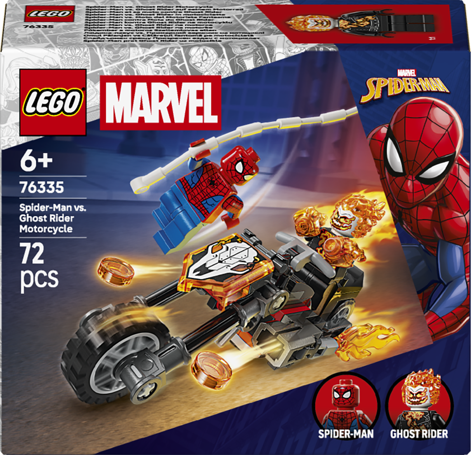 Minifigurka Ghost Ridera przedstawiona jest jako szkielet z płomieniami wydobywającymi się z rąk i głowy. Jego kultowy zabawkowy motocykl ma dwie rury wydechowe z płomieniami i dwa wbudowane miotacze klocków. Pajęczą sieć minifigurki Spider-Mana można przymocować do LEGO motocykla, co oferuje nieograniczone możliwości zabawy w odgrywanie ról na jednośladzie i poza nim.