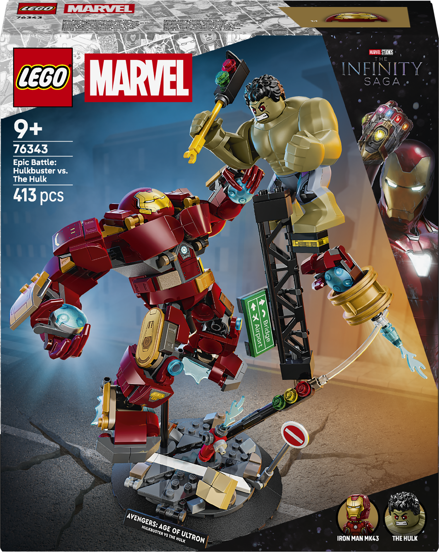 Iron Mana walczy z Hulkiem, korzystając z pomocy swojej zbroi Hulkbuster, na ulicy pełnej gruzu, zawalonych konstrukcji stalowych i sygnalizacji świetlnej, którą Hulk może wykorzystać jako broń. Figurka Hulkbustera jest w pełni ruchoma, co poszerza możliwości zabawy. Dzięki solidnej podstawce i płytce z nazwą dzieci mogą wykorzystać swój model kolekcjonerski jako dekorację do pokoju lub ozdobę na biurko. Można też odłączyć minifigurki LEGO ǀ Marvel, aby odgrywać własne przygody superbohaterów.