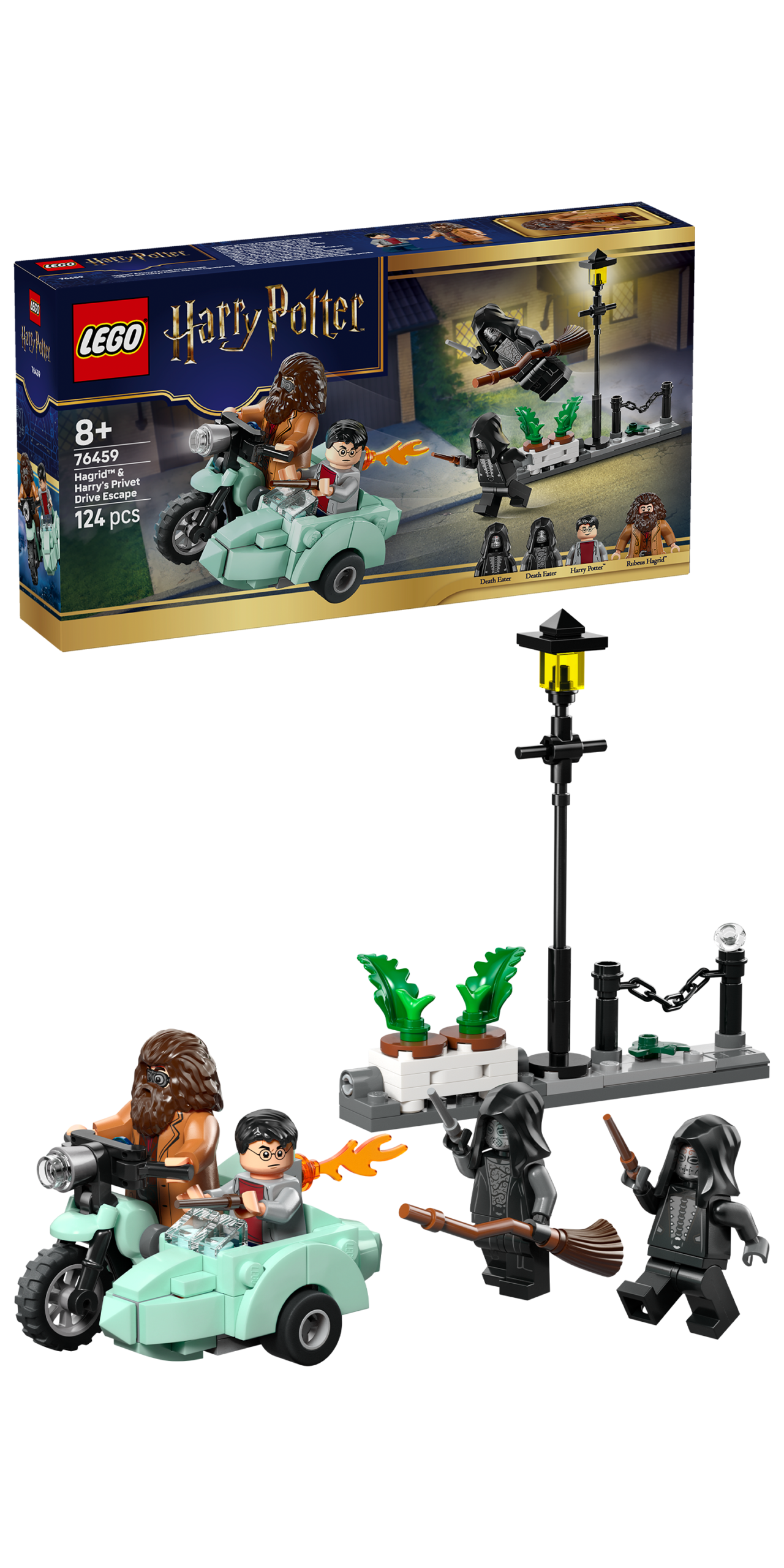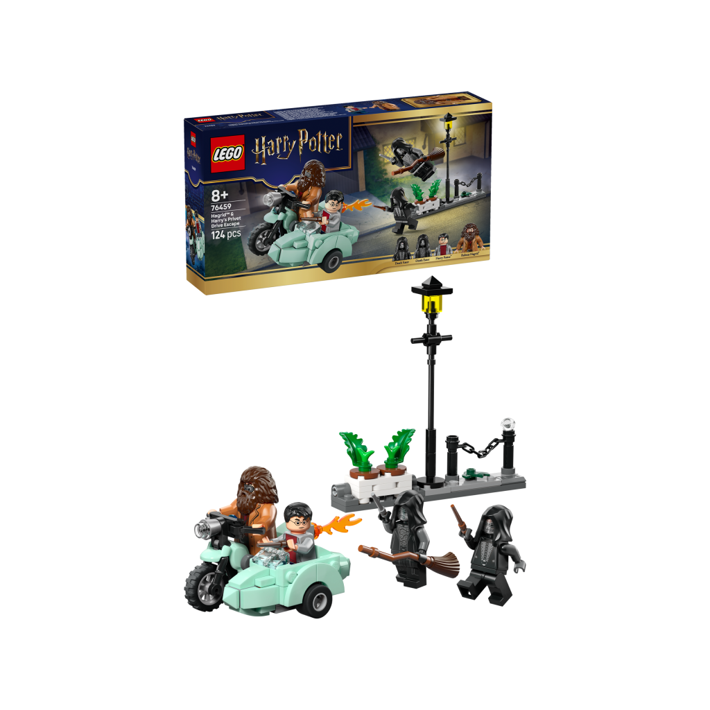 Dzieci mogą umieścić minifigurkę Rubeusa Hagrida na motocyklu LEGO, a Harry’ego Pottera w koszu. Potem ustawić dwie minifigurki śmierciożerców na Privet Drive, gdzie znajduje się latarnia i doniczki z kwiatami, które można przewrócić podczas brawurowej ucieczki bohaterów.