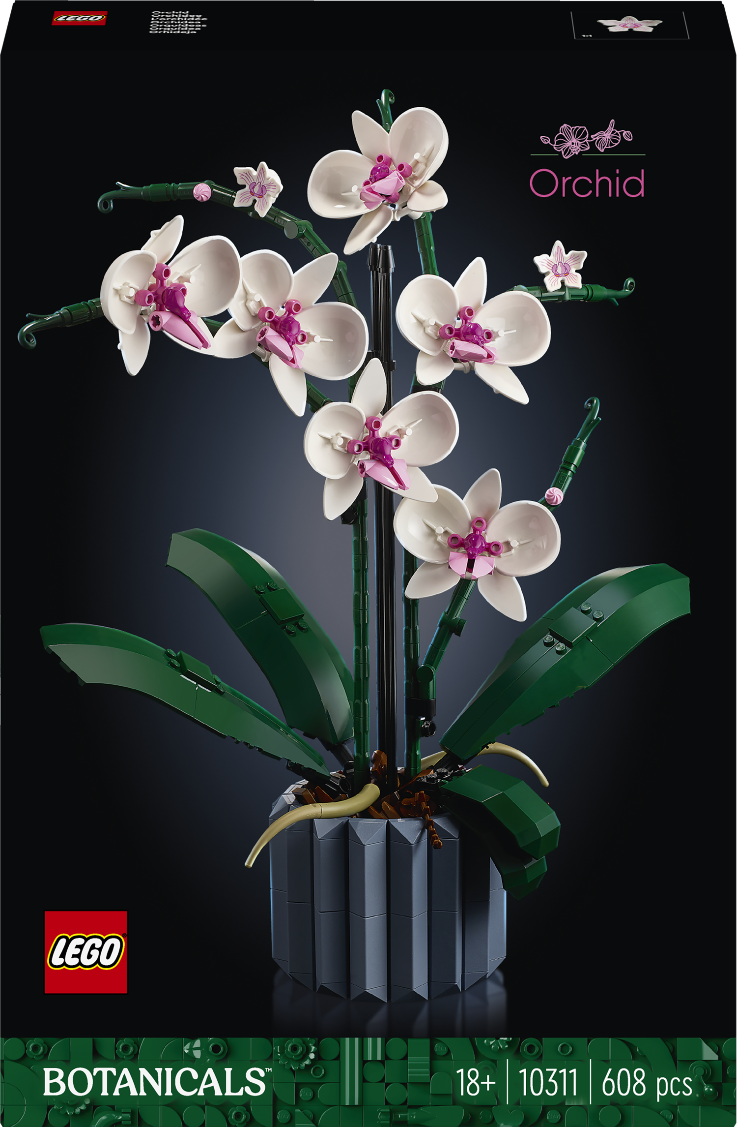 Projekt konstrukcyjny dla dorosłych LEGO® Orchidea (10311) to nie tylko trening uważności, ale i możliwość zbudowania pięknej rośliny do ozdoby domu. Bez pośpiechu złóż z klocków wszystkie szczegóły biało-różowych kwiatów i wazonu. Inspirowany prawdziwymi orchideami model ma pięć liści u podstawy oraz dwa ruchome korzenie powietrzne, które nadają roślinie realistyczny wygląd. Niebieski żłobkowany wazon złożony z klocków można wypełnić brązowymi elementami LEGO przedstawiającymi podłoże z kory, w którym rosną prawdziwe orchidee.