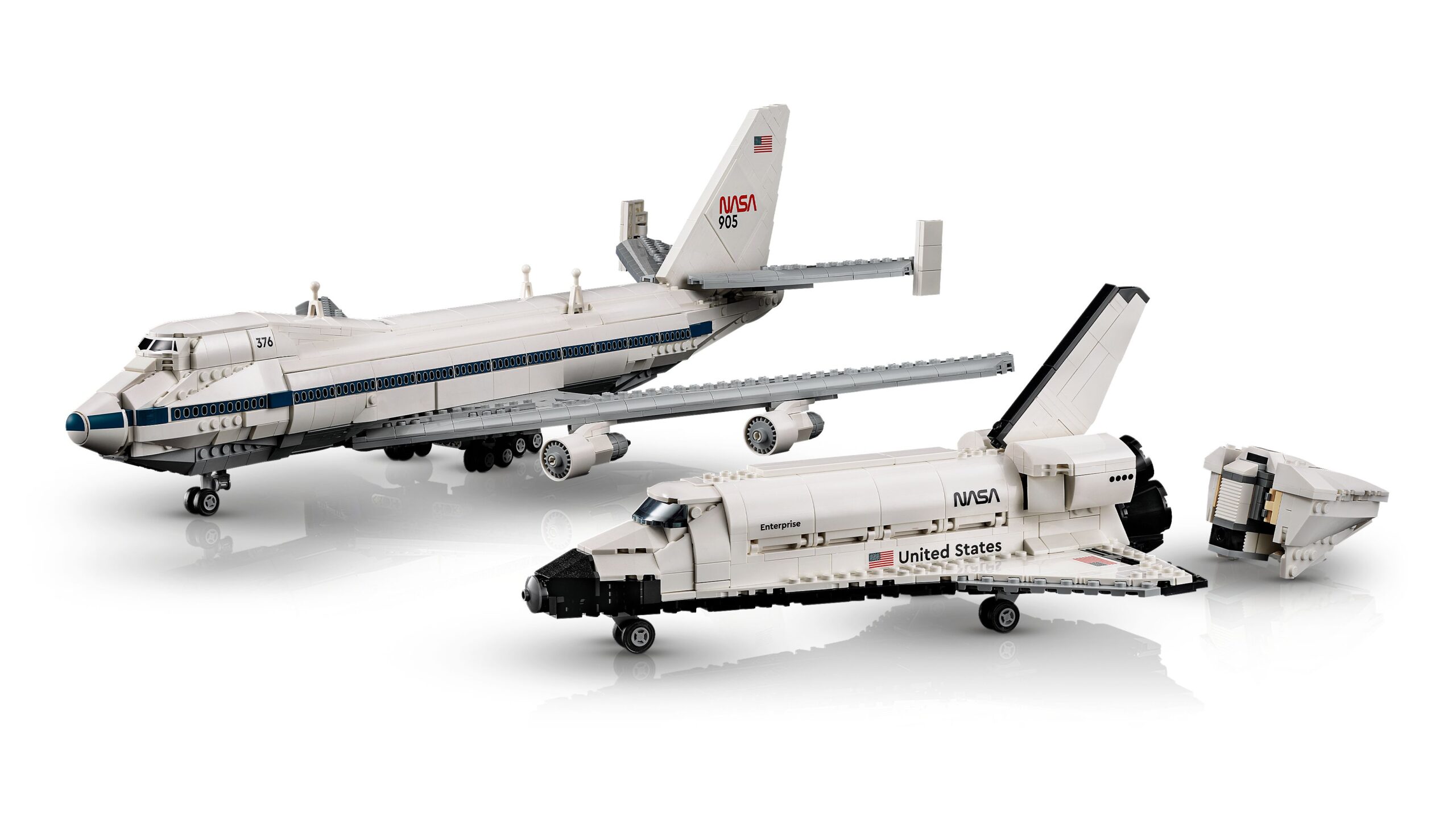 Samolot Boeing charakteryzuje się eleganckim kształtem kadłuba, rozkładanym 18-kołowym podwoziem i systemem mocowania wahadłowca. Model promu kosmicznego NASA Enterprise jest wyposażony w przyczepiany stożek ogonowy, a także odłączane silniki i podwozie, które można schować w ładowni. Całość uzupełnia solidna podstawka z tabliczkami informacyjnymi do każdego modelu.