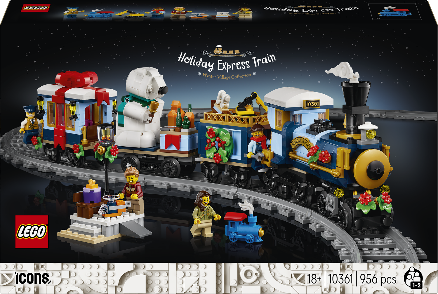 Zestaw LEGO Icons Świąteczny ekspres (10361) już tu jest! Zbuduj klimatyczny, świąteczny pociąg z lokomotywą z wyskakującym kominem, wagonem węglowym, platformą z niedźwiedziem polarnym trzymającym dzwonek oraz wagonem mieszkalnym z meblami. Ten zestaw konstrukcyjny dla dorosłych zawiera cztery minifigurki, peron z ławką i latarnią oraz minimodele, w tym wydrukowany w 3D element pociągu. Zbuduj tor wokół swojej choinki i połącz zestaw z modułem LEGO Powered Up (sprzedawany osobno), aby wprawić lokomotywę w ruch.