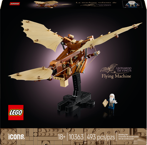 - Zawartość pudełka — zestaw zawiera wszystko, czego potrzeba do zbudowania szczegółowej repliki wizjonerskiego skrzydłowca Leonarda da Vinci, a także podstawkę do ekspozycji oraz minifigurkę Leonarda da Vinci z piórem i szkicem