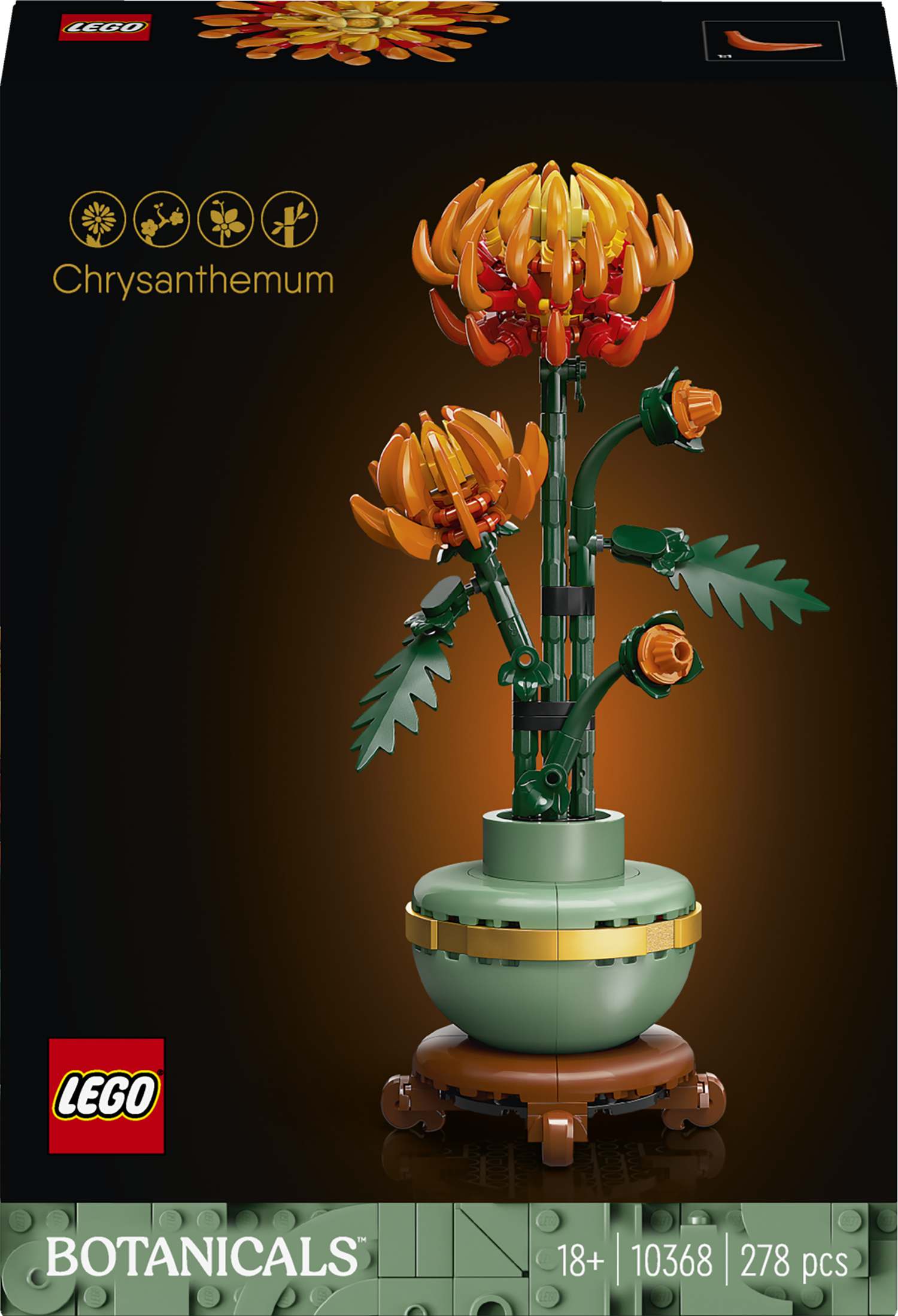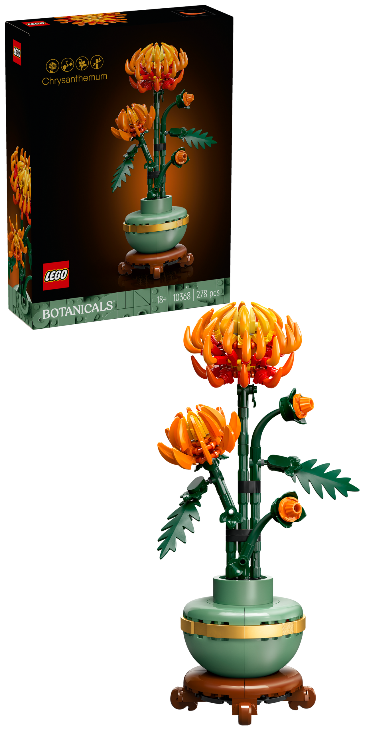 Ta szczegółowa replika z ruchomymi liśćmi i płatkami przedstawia jaskrawopomarańczowy kwiat w formie pąka, rozkwitającego kwiatu i w pełni rozkwitu. Do zestawu dołączona jest pastelowa zielona doniczka ozdobiona złotą obwódką i cokołem z efektem drewna. Łatwy w budowaniu model chryzantemy stanowi elegancką ozdobę każdej przestrzeni i będzie się świetnie prezentować w towarzystwie innych zestawów z kolekcji botanicznej LEGO (sprzedawanych osobno).