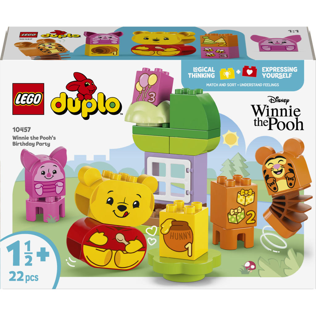 Dzieci wyobrażają sobie, że idą na przyjęcie w towarzystwie 3 figurek LEGO DUPLO: Kubusia Puchatka, Tygryska i Prosiaczka. Postacie mają dwie różne miny, co inspiruje dzieci do wymyślania historii. Ta zabawka do odgrywania ról wspiera także rozwój umiejętności społeczno-emocjonalnych, kiedy dzieci odkrywają różne emocje towarzyszące przyjęciom — od radości z otwierania prezentów po dyskomfort po zjedzeniu zbyt wielu smakołyków.
