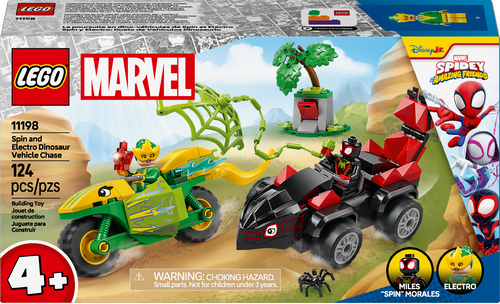 Zestaw pozwala odtwarzać sceny z serialu Spidey i super-kumple. Zawiera dwie minifigurki superbohaterów i dwa dinopojazdy do popychania: Miles „Spin” Morales w samochodzie w kształcie stegozaura i Electro na motocyklu w kształcie dilofozaura. Duży element z siecią, kryształ ukryty w skale oraz akcesoria z tłem inspirują dzieci do kreatywnej zabawy w odgrywanie ról. Każda torebka w pudełku zawiera klocki i duży klocek startowy do szybkiego zbudowania modelu i postaci, dzięki czemu zabawa zaczyna się szybko. Do zestawu dołączone są intuicyjne instrukcje w formie kolorowego przewodnika z ilustracjami.