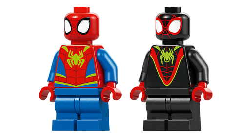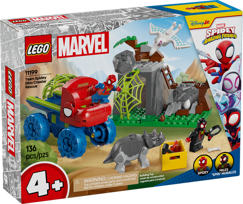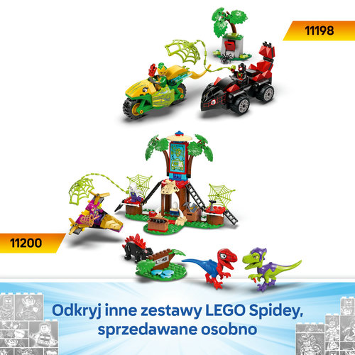 Ten zestaw LEGO® do zbudowania zawiera minifigurki Spidey’ego i Milesa „Spina” Moralesa oraz dwie figurki dinozaurów: Ghost-Spider jako pterodaktyl i Rhino jako triceratops. W zestawie jest też dinoterenówka z dużą pajęczyną przymocowaną z tyłu, uruchamiana przełącznikiem funkcja spadającej skały, jajo dinozaura do odkrycia i pajęczyna, którą można opuścić, by uwięzić złoczyńcę. W zestawie znajdują się intuicyjne instrukcje w formie kolorowego przewodnika z ilustracjami, a osobne torebki zawierają klocki i duży klocek startowy, dzięki czemu budowanie jest szybkie i łatwe.