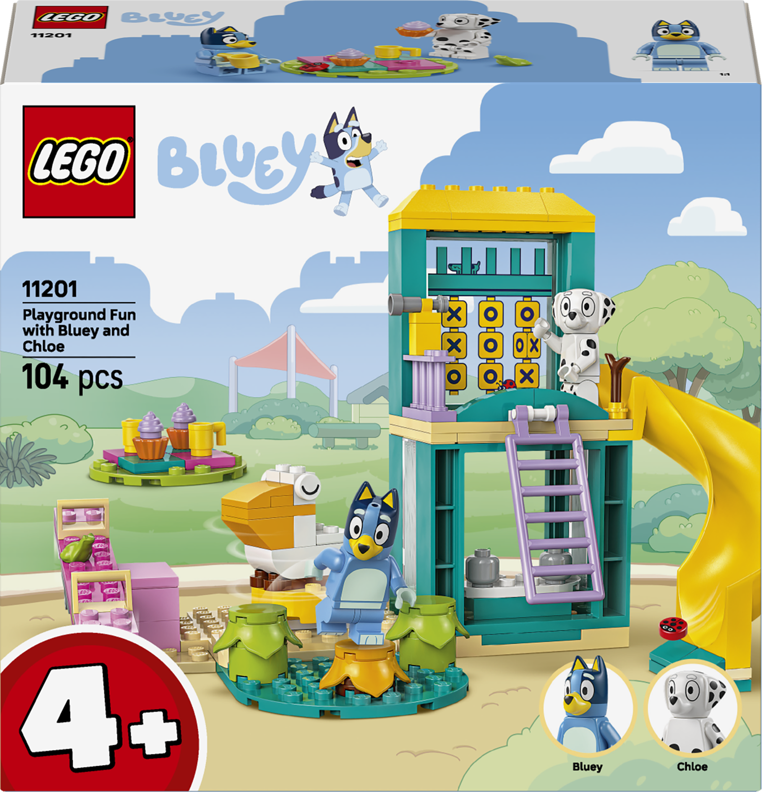 Blue i Łatki, które bawią się na kolorowym placu zabaw LEGO z huśtawką, zjeżdżalnią, małpim gajem i obracającą się figurką pelikana. W zestawie znajdują się także trzy LEGO roślinki, wieża z teleskopem oraz strefa piknikowa z napojami i ciastami. W pudełku są osobne torebki z modelami do zbudowania, klocek startowy i proste instrukcje, które sprawiają, że budowanie jest szybkie i przyjemne. Instrukcje mają formę kolorowej broszury — w sam raz dla fanów zabawek edukacyjnych.