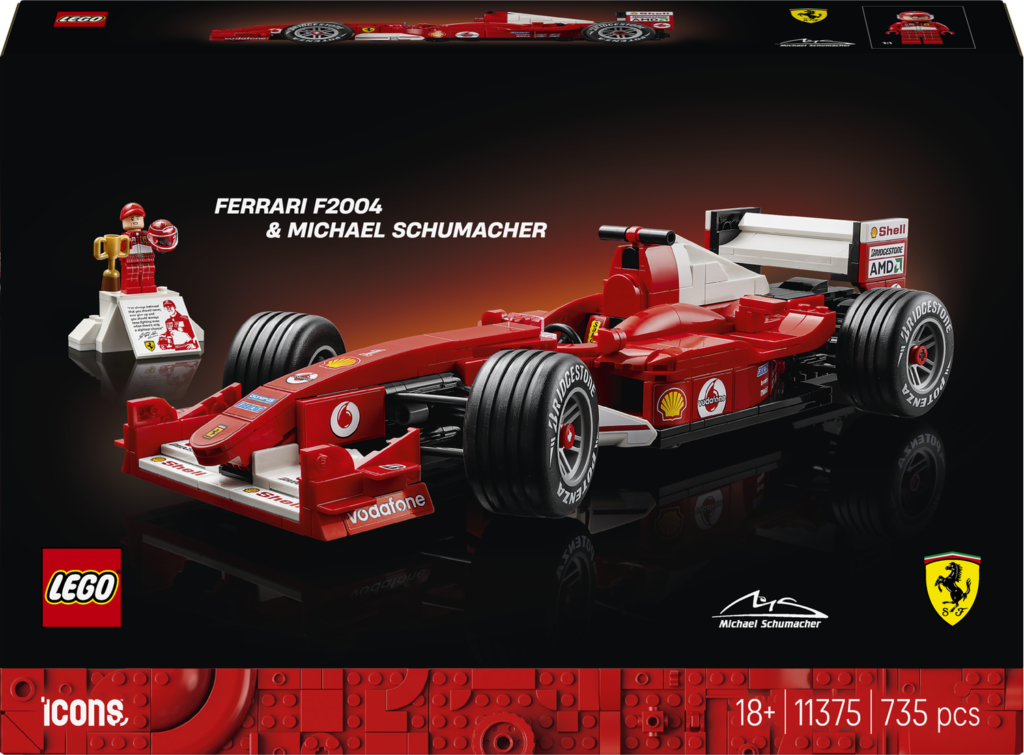 Świętuj złotą erę wyścigów Formuły 1 dzięki zestawowi klocków LEGO Icons Ferrari F2004 i Michael Schumacher (11375). Ten zestaw dla dorosłych pozwala na stworzenie repliki w skali legendarnego bolidu, który z Michaelem Schumacherem za kierownicą zdominował sezon wyścigowy 2004. Model Ferrari LEGO ma działający układ kierowniczy, rowkowane opony typu slick i szczegółowy silnik V10, a także podstawkę z informacjami o pojeździe i statystykami. Minifigurka Michaela Schumachera jest wyposażona w kask, trofeum zwycięzcy oraz podstawkę w stylu podium z nadrukowaną grafiką i cytatem z siedmiokrotnego mistrza świata.