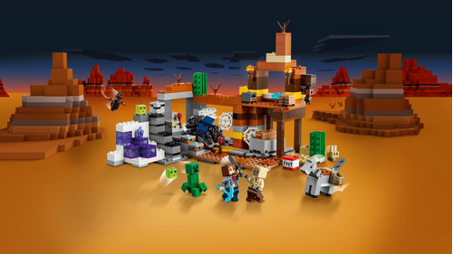 Dzieci dołączą do badacza Badlandów w opuszczonej kopalni w biomie Badlandów, gdzie umieszczają dynamit i uruchamiają funkcję eksplozji, aby odsłonić kryształy miedzi, złota, czerwienitu i ametystu. Następnie załadują wagonik i pomkną torami, aby opuścić kopalnię. Stamtąd wyruszą w towarzystwie osiołka (wraz z dużymi sakwami) do bazy badacza z łóżkiem i wyposażeniem rzemieślniczym. Wrogie moby, z którymi trzeba walczyć po drodze, obejmują pająka jaskiniowego z Minecrafta, Creepera™, posucha i dwa szlamy. Dodatkową cyfrową zabawę zapewnia intuicyjna aplikacja LEGO® Builder, w której konstruktorzy mogą powiększać, obracać modele w 3D i śledzić postępy.