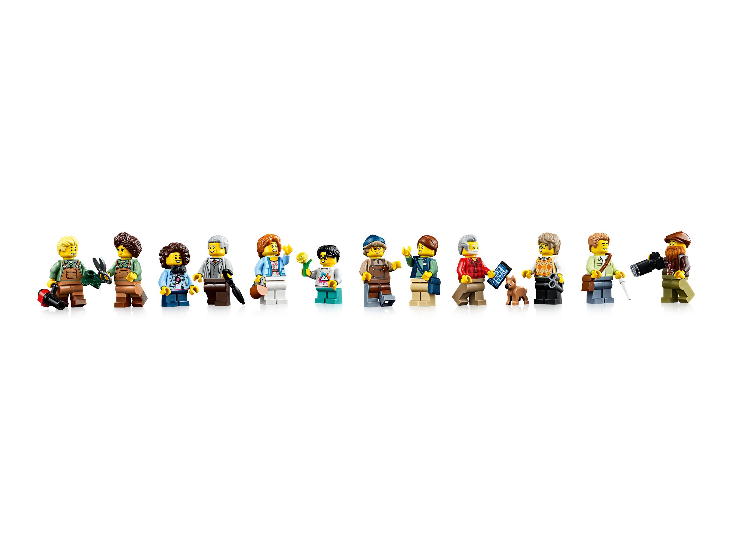 - 12 minifigurek LEGO® — w tym menedżer, dwóch ogrodników, barista oraz goście, a także figurki psa, wiewiórki, królika, czterech ptaków i żuka