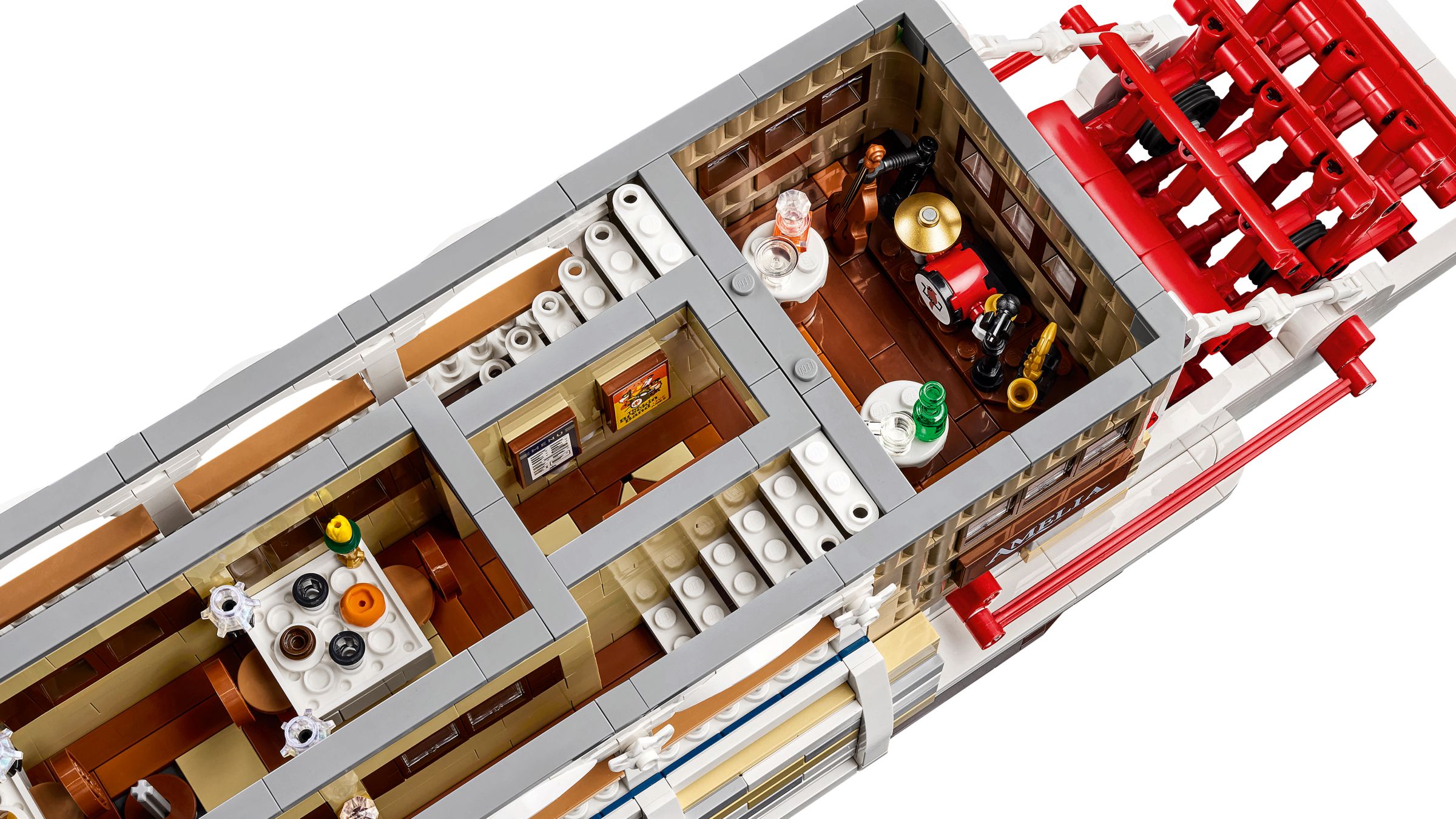 Popchnij łódź po powierzchni, aby aktywować koło łopatkowe połączone z silnikiem „parowym”, zakręć kołem sterowym w sterówce (lub pokrętłem na zewnątrz), aby aktywować ster, podnieś/obróć platformy abordażowe i rzuć kotwicę. Następnie zwiedź sterówkę, kabinę załogi i łazienkę na pokładzie dodatkowym, scenę muzyczną i restaurację na pokładzie głównym oraz pokład kotłowy, na którym znajduje się kuchnia i muzeum silników parowych, w którym można zobaczyć działający tłok w wersji LEGO, maszynę parową Watta i wiele więcej.