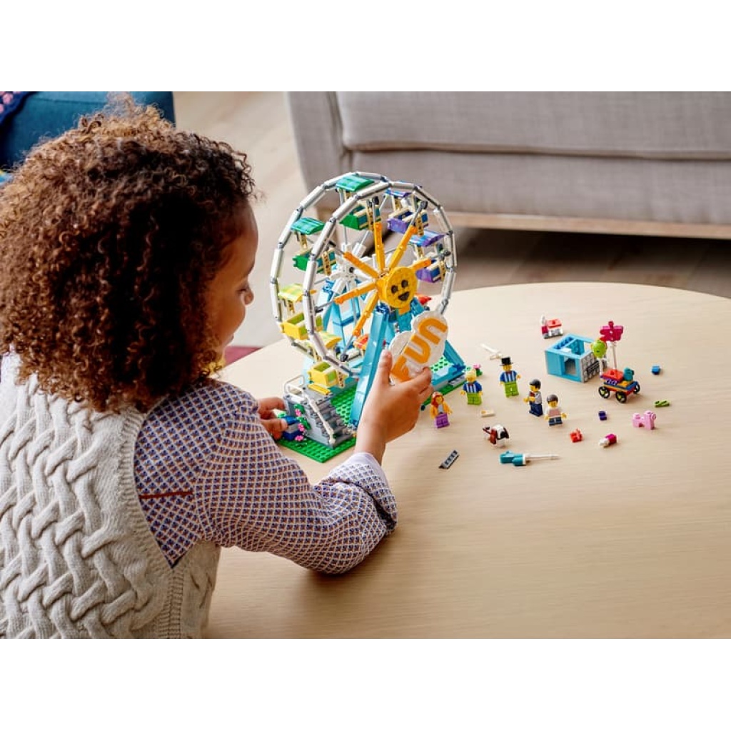 Z tym rewelacyjnym zestawem LEGO Creator 3 w 1 zabawa nigdy się nie kończy, ponieważ dzieci mogą zbudować z niego trzy różne modele. Mogą zacząć od złożenia diabelskiego młyna, potem przebudować go na autka dla dzieci, przemienić na huśtawki w kształcie łódek albo zbudować z dostępnych klocków coś zupełnie nowego.