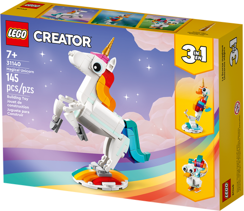 Dzięki temu zestawowi konstrukcyjnemu 3 w 1 Magiczny jednorożec (31140) kreatywne dzieci w wieku od siedmiu lat mogą przenieść się do mitycznej krainy, gdzie będą odgrywać emocjonujące historie. Zestaw zawiera jednorożca ze złotym rogiem, kolorowym ogonem oraz ruchomymi nogami i kopytami. Można go prezentować w dwóch różnych pozycjach: może stać na czterech nogach lub na dwóch tylnych nogach, aby uzyskać kultową pozę na tęczowej podstawce.