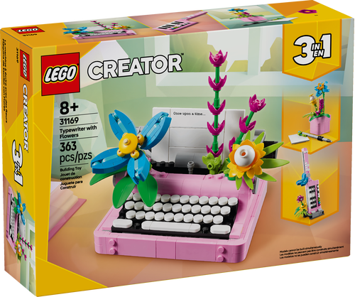 Podaruj ośmioletnim i starszym fanom kwiatów, sztuki i designu ten zestaw LEGO® Creator 3 w 1 Maszyna do pisania z kwiatami (31169). Ta miniaturowa maszyna do pisania jest ozdobiona czterema kolorowymi kwiatami z klocków, obejmuje ruchomą klawiaturę i wałek oraz arkusz papieru zbudowany z klocków.