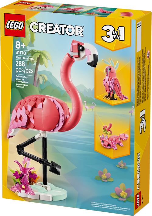 - Trzy dzikie zwierzęta do zbudowania w jednym pudełku — zestaw LEGO® Creator 3 w 1 Dzikie zwierzęta: różowy flaming umożliwia ośmiolatkom i starszym dzieciom zbudowanie i przebudowanie trzech różnych zwierząt z tych samych klocków