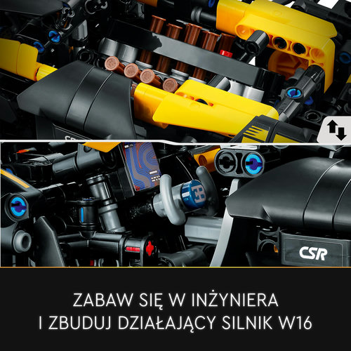 - Przyciągające uwagę detale – dzieci mogą budować i odkrywać pracę silnika W16, układ kierowniczy i drzwi skrzydłowe samochodu wyścigowego Bugatti