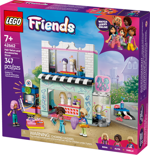 Siedmiolatki i starsze dzieci będą się z chęcią bawić w odgrywanie ról dzięki zestawowi LEGO® Friends Salon fryzjerski i sklep z ozdobami (42662). Zabawka zawiera trzy minilaleczki LEGO Friends i mnóstwo akcesoriów do włosów do kreatywnej zabawy.