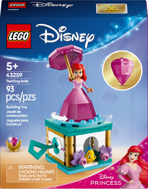 • Zestaw z księżniczką Disneya — zabawka konstrukcyjna zawiera podstawkę z obrotową platformą i kluczem, minilaleczkę LEGO® Disney Arielki w „diamentowej” sukni, która się zmienia, oraz figurkę LEGO Disney rybki, Florka