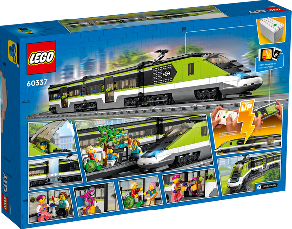 Zestaw LEGO® City Ekspresowy pociąg pasażerski (60337) zawiera zdalnie sterowaną lokomotywę z działającymi, ściemnianymi przednimi reflektorami i technologią Powered Up, wagon restauracyjny, wagon pasażerski, peron, 24 elementy torów kolejowych i sześć minifigurek do nieograniczonej zabawy w odgrywanie ról.