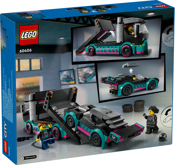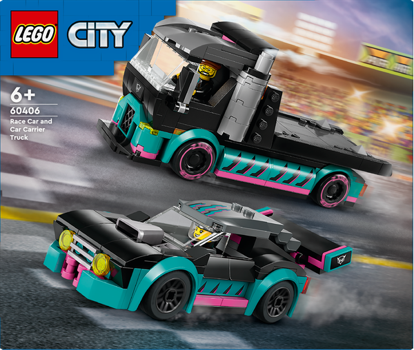 - Laweta — fani samochodów wyścigowych i ciężarówek w wieku od sześciu lat mogą cieszyć się nieograniczoną zabawą dzięki temu zestawowi LEGO® City Samochód wyścigowy i laweta