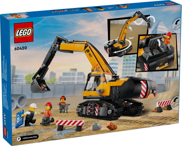 Zaskocz małych budowniczych w wieku od ośmiu lat żółtą koparką LEGO® City (60420). Ta realistyczna zabawka do złudzenia przypomina prawdziwą koparkę z przyczepnymi gąsienicami, wielofunkcyjnym wysięgnikiem i kabiną kierowcy obracaną o 360 stopni. Zestaw zawiera również dwie barierki oraz minifigurki kierowcy, pracownika i architekta, które umożliwiają pomysłowe odgrywanie ról i opowiadanie historii.