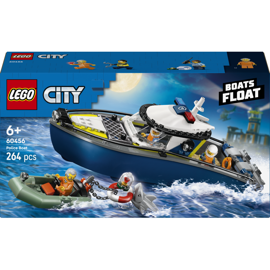 Z zestawem LEGO City Pościg łodzią policyjną (60456) dzieci od sześciu lat wyruszą na pełną akcji przygodę. Ta zabawka konstrukcyjna dla dzieci zawiera klocki LEGO City, z których można zbudować łódź policyjną z dwoma silnikami zaburtowymi i celą oraz ponton z napędem dla złodziejaszka. W komplecie są także minifigurki policjantów i złodziejaszka, figurka rekina oraz skradziony rubin — to świetny pomysł na prezent dla chłopca lub dziewczynki, którzy interesują się tematyką policji i zabawkami LEGO.