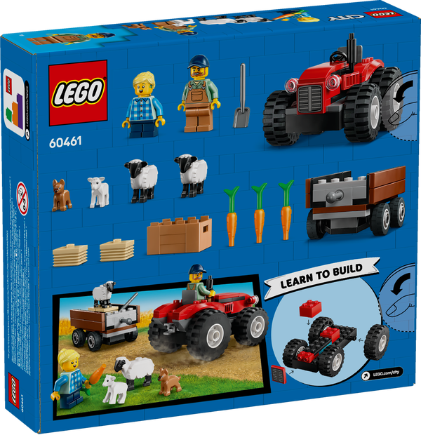 Pokaż czterolatkom i starszym dzieciom prawdziwe uroki wsi, wręczając im zestaw LEGO® City Czerwony traktor z przyczepą i owcą (60461). Zawiera on czerwony traktor z odłączaną przyczepą, kosz marchewek i dwie bele siana. Wystarczy dodać minifigurki rolnika i wnuczki, a także dwie figurki owiec, figurkę jagnięcia i szczeniaka, które umożliwiają ciekawe odgrywanie ról i opowiadanie historii.