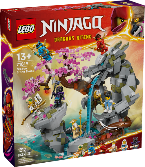 - Zestaw ze smoczą świątynią dla dzieci — chłopcy i dziewczynki w wieku od 13 lat mogą budować, bawić się i ustawiać na półce tę dużą Świątynię Smoczego Kamienia z ruchomymi elementami i mnóstwem minifigurek postaci NINJAGO®