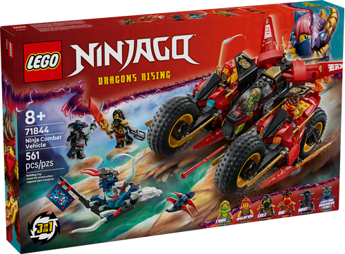 Dzięki zestawowi 3 w 1 Pojazd bojowy ninja (71844) dzieci w wieku od ośmiu lat mogą odgrywać sceny z trzeciego sezonu serialu NINJAGO® Powstanie Smoków. Po zabawie dużym motocyklem ninja mogą rozdzielić go na trzy mniejsze pojazdy: motocykl Kaia, motocykl Wyldfyre i odrzutowiec Fraka z dwoma miotaczami klocków.