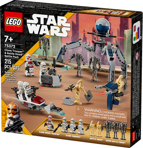 - Cztery minifigurki LEGO® Star Wars™ i pięć figurek LEGO do zabawy — żołnierz-klon z oddziału uderzeniowego, trzech żołnierzy-klonów, trzy superdroidy bojowe i dwa droidy bojowe z akcesoriami