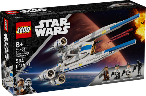 - Zestaw z modelem myśliwca dla dzieci — przeżyj bohaterskie przygody z drugiego sezonu serialu Star Wars: Andor™ LEGO® na pokładzie myśliwca U-Wing Rebelii