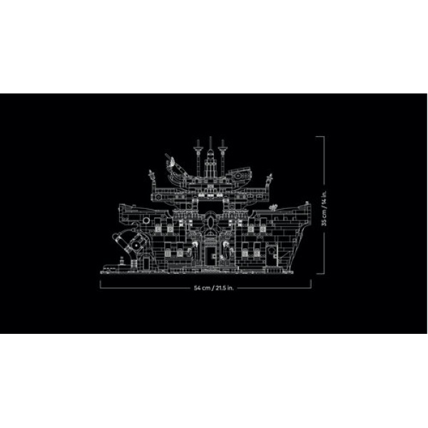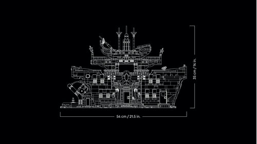 W imponującym statku znajdują się liczne pomieszczenia, takie jak kuchnia i jadalnia, prywatna kwatera Zeffa czy skarbiec. Dzięki 10 minifigurkom LEGO — Luffy’ego, Zoro, Nami, Usoppa, Sanjiego, Zeffa, Garpa, Helmeppo, Koby’ego i Mihawka — można z łatwością odtworzyć niezapomniane sceny z serialu. W zestawie znalazło się także wiele realistycznych akcesoriów, w tym pięć plakatów z poszukiwanymi postaciami.