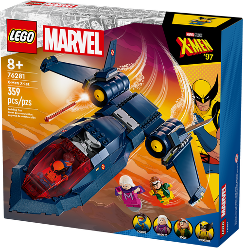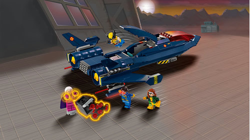 - Zabawkowy samolot X-Menów do zbudowania — odrzutowiec ma dwa miotacze klocków po obu stronach, dwie wyrzutnie sprężynowe pod spodem i dwa wyjmowane pojemniki, w których dzieci mogą przechowywać klocki i przyczepiane pazury Wolverine’a