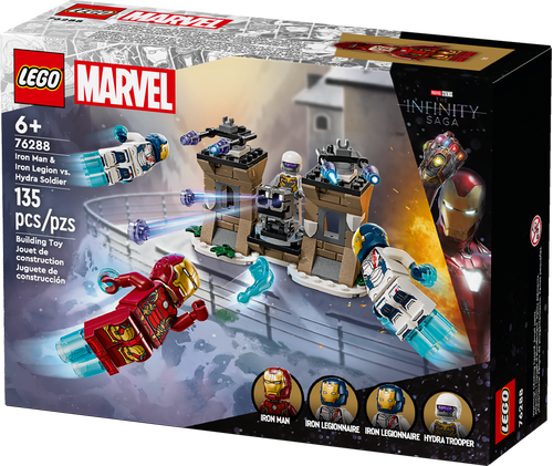Zestaw LEGO® Marvel Iron Man i Iron Legion kontra żołnierz Hydry (76288) odtwarza scenę z filmu Avengers: Czas Ultrona, w której Iron Man i dwóch członków Iron Legion lecą do bazy Hydry. Zawiera on mnóstwo ciekawych funkcji i akcesoriów, które zachwycą sześciolatków i starsze dzieci, a zwłaszcza fanów Avengersów.